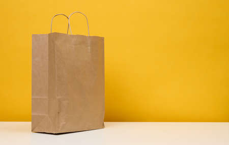 Brown craft paper bag on yellow background. Recycled paper shopping bag, lunch bag
