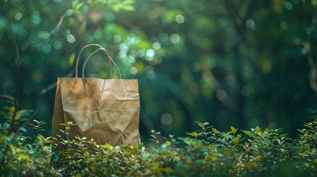 Green retail banner: Recycled kraft bag on a vibrant nature background