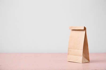 Paper bag on table against light background