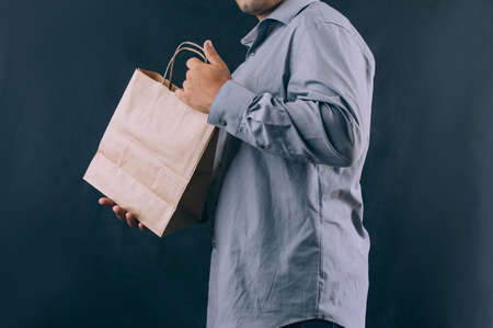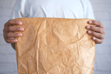Closeup view of mans hand with paper bag to delivery.