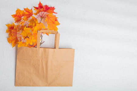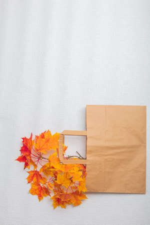 Yellow and red maple leaves in a paper bag. There is a place for text On a white background. View from above . Autumn layout. High quality photo