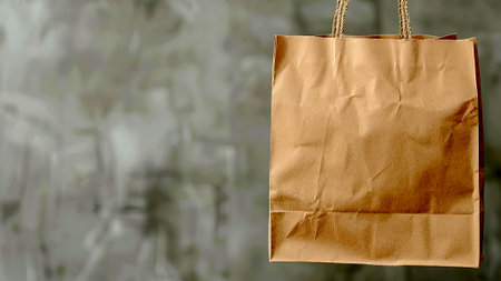 A brown paper bag hangs against a blurry gray background. The bag is made of brown paper and has a brown paper handle. It is slightly wrinkled.