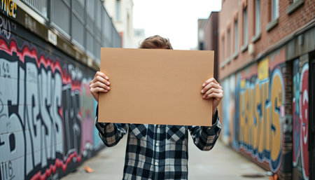 A person in a plaid shirt hides their face behind a blank sign in a graffiti-covered urban alley.