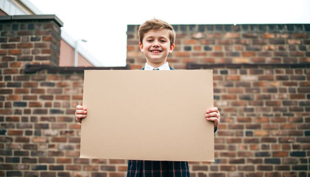 A smiling boy in a school uniform holds a large blank sign in front of a brick wall.