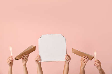 Many hands with food containers and cutlery on color background