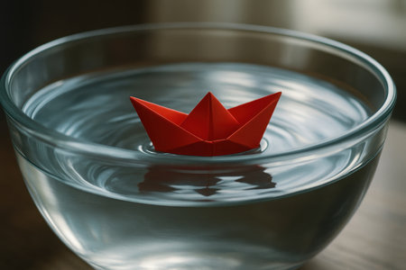 Red paper boat floating on the calm surface of water in a transparent glass bowl, creating gentle ripples. symbolizes fragility, journey, and simplicity.
