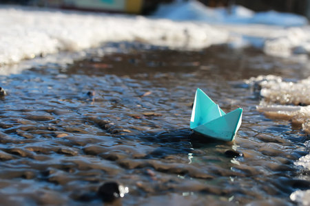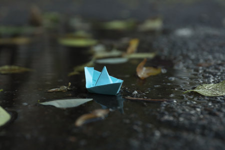 Paper boat is floating in a puddle of rain. The boat is small and blue, and it is surrounded by water. The scene is peaceful and calming