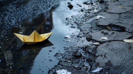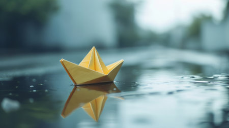 Yellow paper boat on a wet asphalt surface with reflective puddles