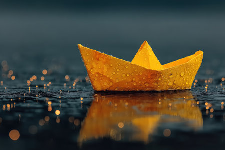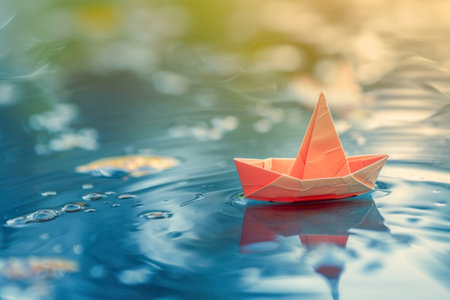 A delicate paper boat floats gently on a tranquil water surface, capturing reflections and inviting a sense of calm and nostalgia.
