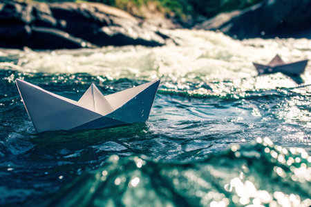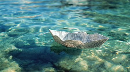 Paper boat made from newspaper floating in clear water, symbolizing imagination, exploration, and play