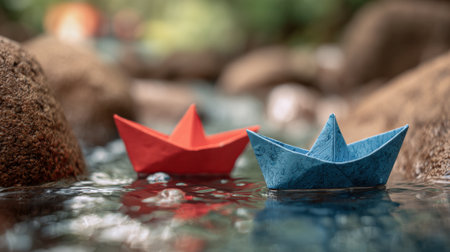 Two vibrant paper boats drift peacefully on clear water among smooth stones in a tranquil setting.
