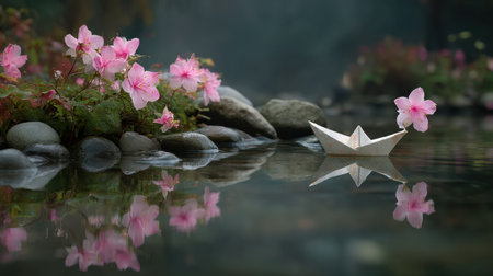 A serene setting captures a delicate paper boat floating on calm water, surrounded by vibrant pink flowers and smooth stones, evoking tranquility.