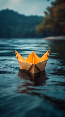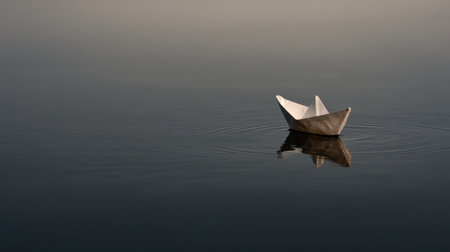 A delicate paper boat floats serenely on calm waters, reflecting a misty background. This tranquil scene encapsulates simplicity and nostalgia in nature.