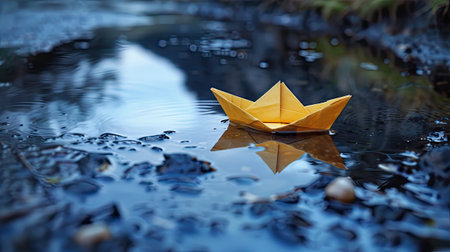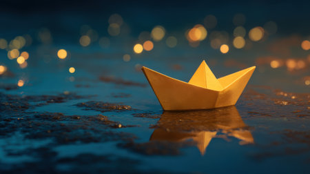 bright yellow origami paper boat resting on a reflective dark water surface with glowing particles, symbolizing creativity, imagination, and childhood memories. ai generated.