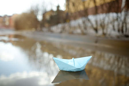 Color origami paper boat in large puddle on street near town houses. paper ship floating in water. Outdoor activities for kids in early spring