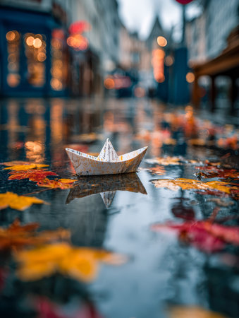 A delicate paper vessel drifts along a damp urban avenue, illuminated by fading twilight, as vibrant fall foliage carpets the pavement with a peaceful, nostalgic mood.