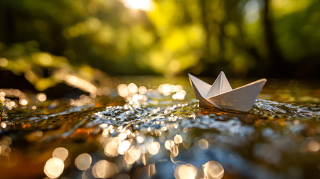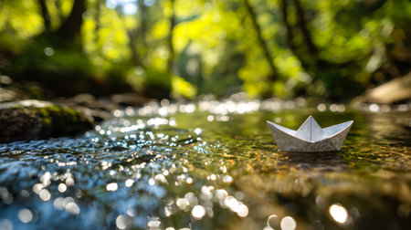 A delicate craft of paper navigates shimmering waters, surrounded by vibrant greenery and dappled sunlight in a tranquil woodland setting.