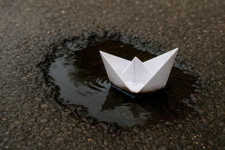 A paper boat sits in a puddle on a paved street, reflecting the golden light of a setting sun. The image showcases the boat with water droplets, demonstrating its form and texture, along with the wet asphalt. Suitable for illustrations about childhood, imagination, or concepts related to travel and adventure.