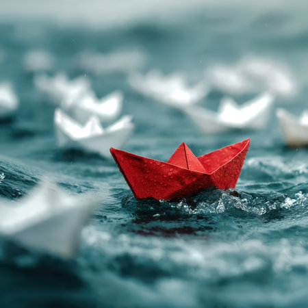 A red origami paper boat leading a line of white paper boats on a calm blue ocean, symbolizing leadership and individuality.
