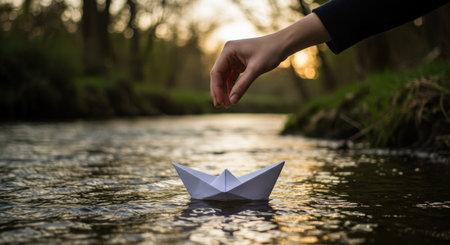 A delicate paper boat gently floats on a serene water surface, capturing reflections of light and creating a dreamy, peaceful ambiance.