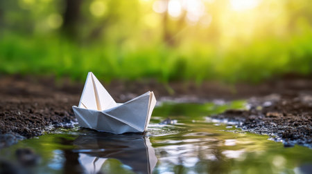 A peaceful scene featuring a delicate paper boat floating gently on a calm stream, surrounded by vibrant greenery and soft sunlight, evoking nostalgia and tranquility.
