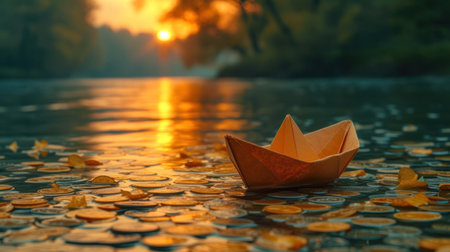 A delicate paper vessel drifts softly on glistening waters, illuminated by warm golden rays that cast tranquil patterns, evoking serenity and gentle dreams.