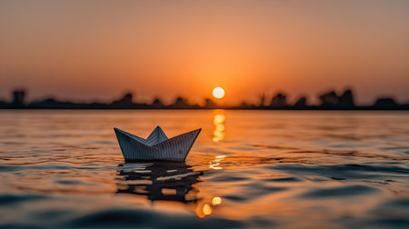 A paper boat floats peacefully on the water under a vibrant sunset. Warm orange and yellow hues dominate the scene, reflecting on the water's surface. The composition features a low angle, capturing the boat's reflection. This image could be used for various commercial or editorial purposes.