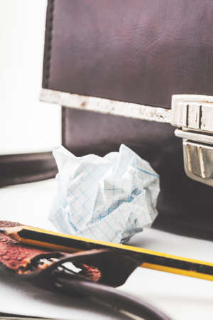 Isolated crumpled paper with leather bag in white background.