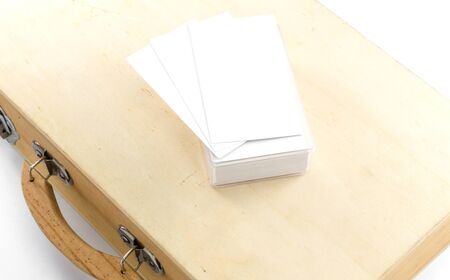 Business card on vintage wooden suitcase