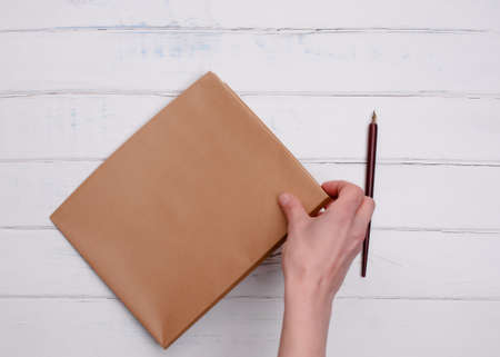 One Craft envelop in hand and ink pencil on the white wooden background