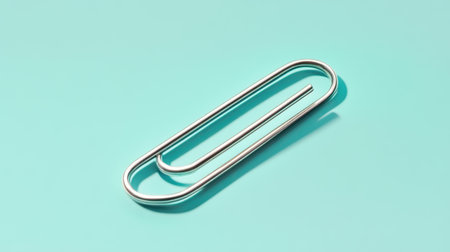 A sleek silver paperclip rests on a vibrant turquoise background, showcasing minimalist design perfect for office and school supplies. Ideal for various projects.