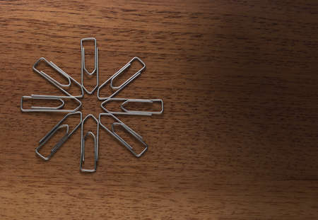A grayscale selective focus shot of white paperclips arranged in a hexagon pattern on a black surface