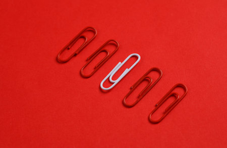 Red and white paper clips on red background. creative layout. business concept. Exclusivity, uniqueness. Don't be like everyone else