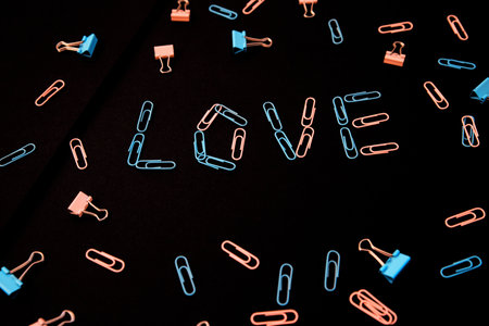 The word love is laid out from paper clips on a black background. The paper clips are pink and blue. The concept of Valentine's Day.