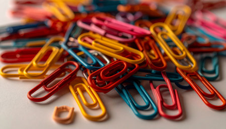 Closeup of colorful paper clips scattered randomly on clean white background, simple school supplies layout, vibrant colors, back to school concept