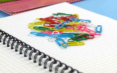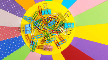Colorful paper clips and colored paper
