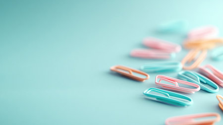 A vibrant collection of paper clips in various pastel shades is artfully arranged on a bright, neutral background, perfect for adding a pop of color to any creative workspace or project.