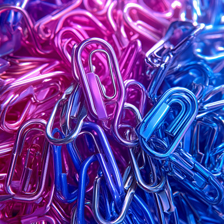 Colorful clips and fasteners arranged creatively on a bright surface with blurred lights in the background