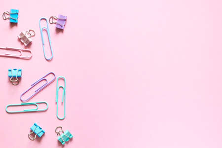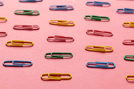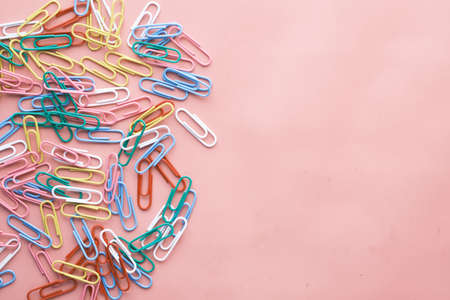 Lot of colored paper clips on pink background. Minimalistic office concept.