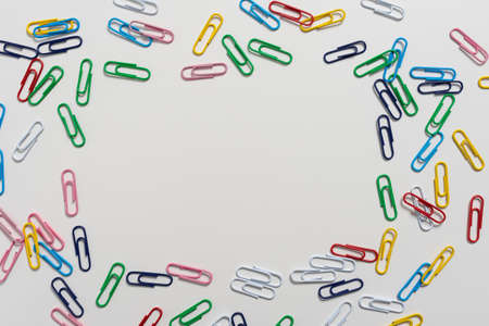 Multi colored paper clips on empty sheet, blue, orange and Green tones. Back to school. High quality photo