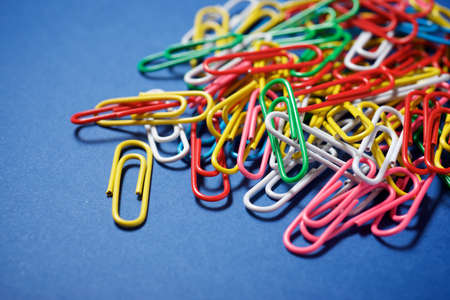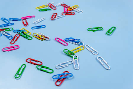Colorful Paper Clips on a Blue Background. office business tool. Items for the Office and Doing Business, Accounting, Business Administration.