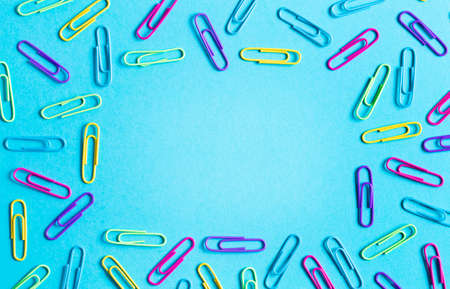 Colored paper clips on pastel blue background. Top view, flat lay. Back to school concept. College, institute education, office work.