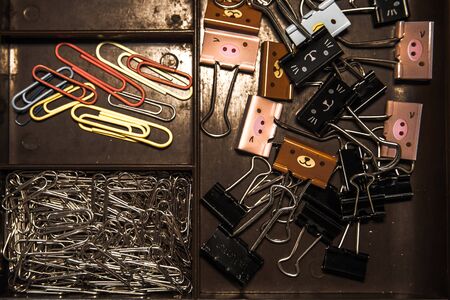 Many type of paper clips in their compartments.