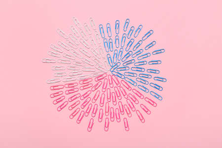 a group of vivid color office metal paper clips for paper on the pale pink mono colour background. minimalism style, top view shot.