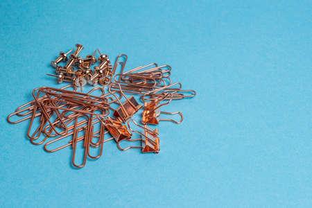 a group of plain copper metal staples, clips, and office studs on a blue textured paper background