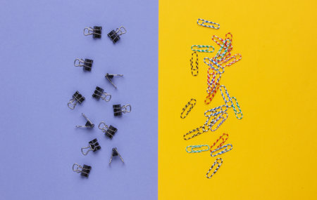 Lot of paper clips on a purplish-yellow background. Top view. Minimalistic office concept