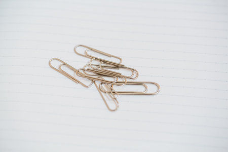 Shiny metal paper clips on a desktop with stationery in a business office. Close view.