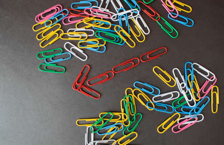 Many colored paper clips on a dark background. The concept of continuing education.
