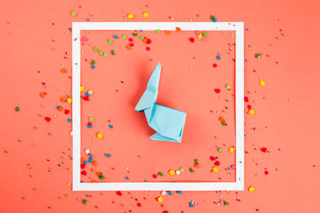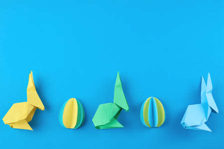 Paper origami Esater rabbits and colored eggs on blue background, top view. Easter celebration concept