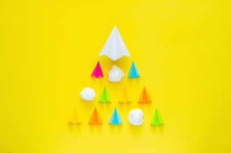 Paper fold airplanes moving with clouds on yellow background. Minimal world tourism day concept.